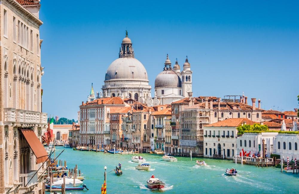 The city of Venice, showing boats on the canal and Basilica di Santa Maria della Salute.