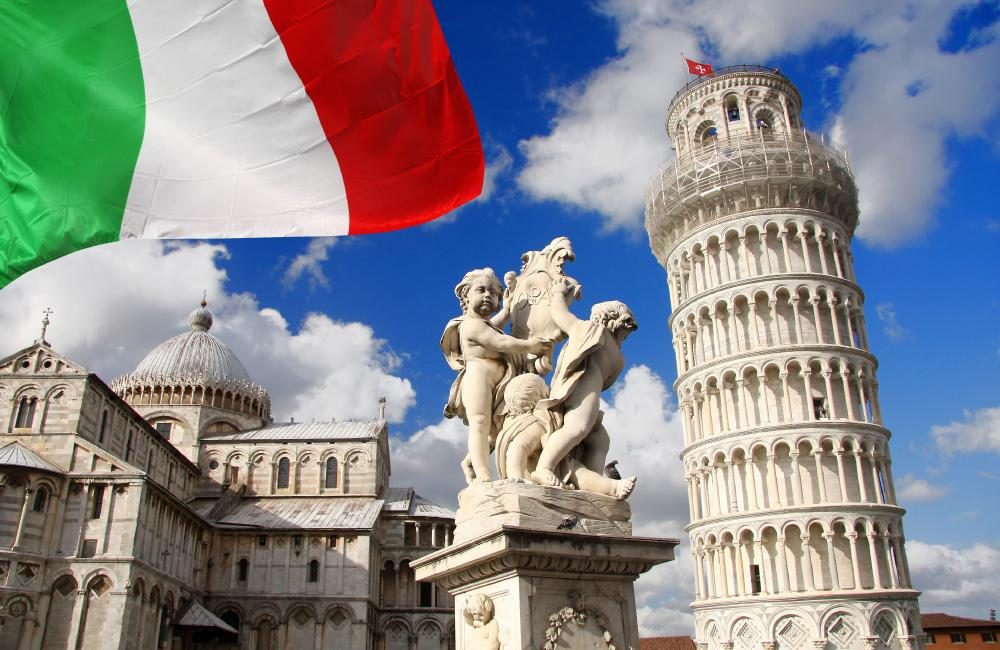 The Leaning Tower of Pisa, a statue, and the Italian flag in Pisa, Italy.